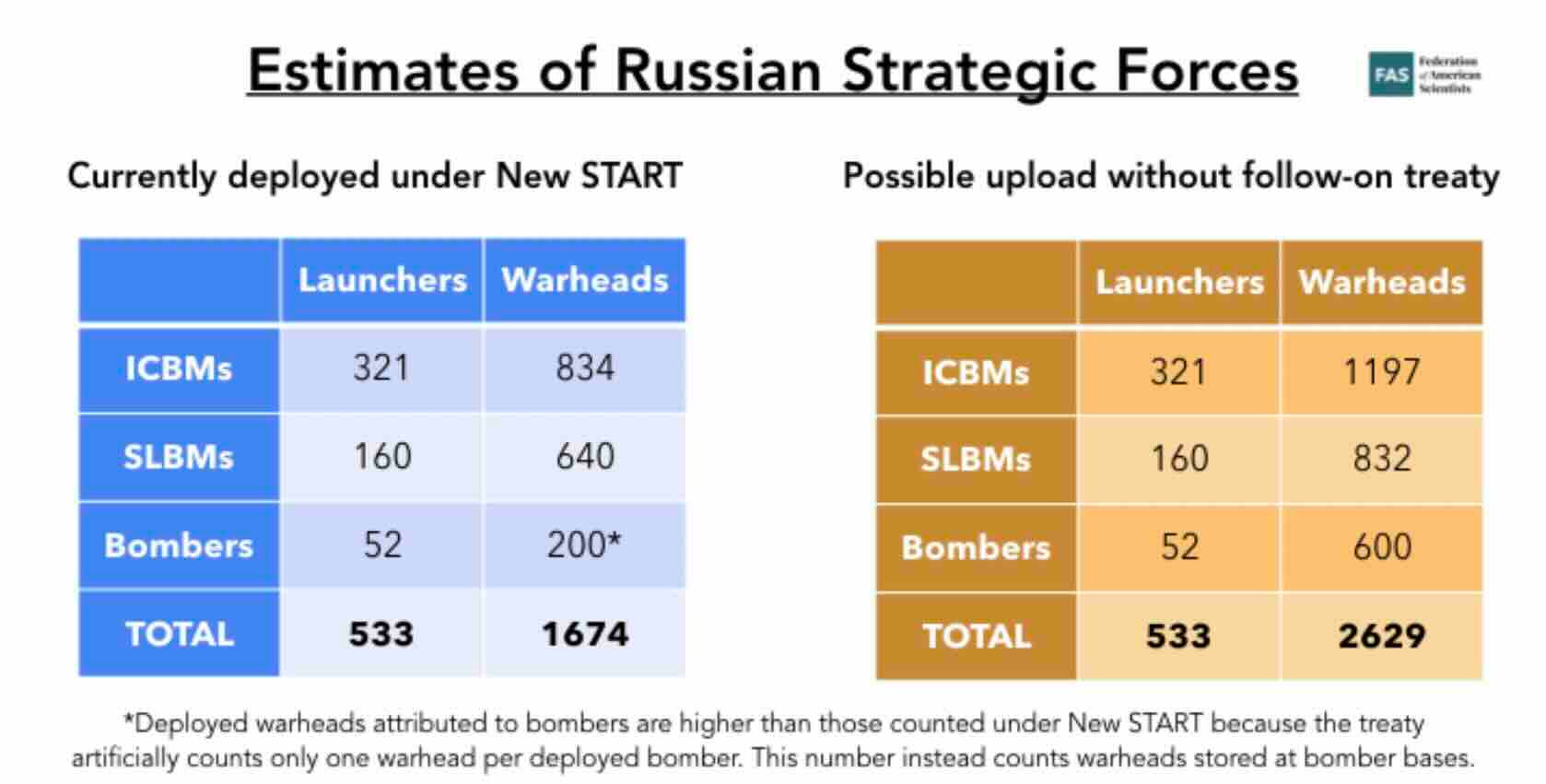 Los gráficos copiados a continuación ilustran el número aproximado de armas nucleares que pasarán al estado desplegadas después del final del Nuevo START: