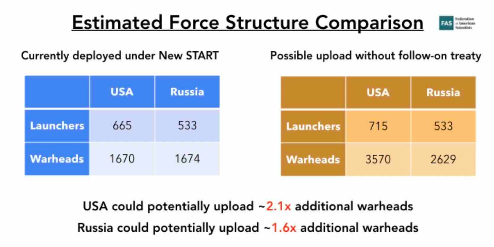 El fin del Nuevo START significa que Estados Unidos y Rusia actuarán rápidamente para añadir miles de armas nucleares estratégicas adicionales –actualmente guardadas en reserva– a cada uno de sus arsenales nucleares desplegados.