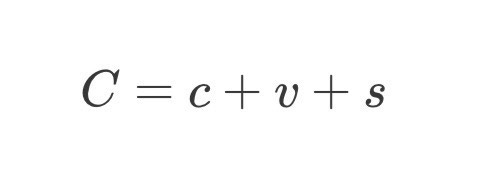 donde C es el precio de la mercancía, c es la cantidad para reemplazar el capital constante (maquinaria, materias primas), v es la cantidad para reemplazar el capital variable (trabajo asalariado), y s es el plusvalor (ganancia para el capitalista). En el ejemplo del lino, digamos que el valor de la maquinaria es c = $0.30 y el valor de la fuerza de trabajo es v = $0.20. Así es como obtenemos el costo de producción de $0.50. Esto deja s = $0.40 para el capitalista. Según la Teoría del Valor Trabajo, el capital variable (es decir, el trabajador vivo que trabaja y da su vida a la maquinaria) produce todo ese plusvalor, mientras que el capital constante simplemente transfiere pero no produce ningún valor nuevo ya que es trabajo muerto (es decir, es maquinaria, un producto del trabajo que ya se ha hecho ). Para asegurar que el capitalista obtenga una ganancia, el trabajador nunca recibe en salario el valor total de su producto. Por lo tanto, es explotado. Su tasa de explotación puede medirse por la relación entre s y v .