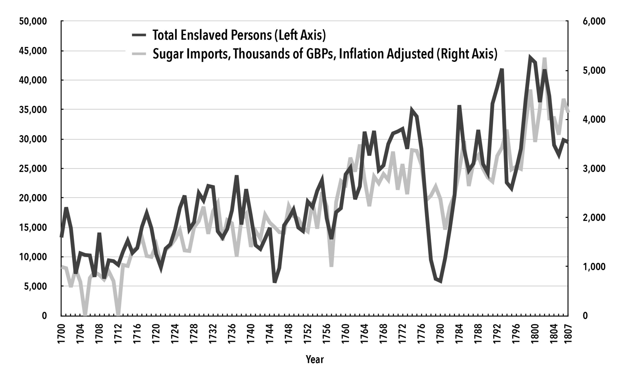 Fuentes y notas: Datos de la Base de Datos sobre la Trata Transatlántica de Esclavos, Viajes de Esclavos (sitio web), 2024, slavevoyages.org; Bryan R. Mitchell, Estadísticas Históricas Británicas (Cambridge: Cambridge Books, 2011 [1988]). El valor monetario de las importaciones de azúcar se ha ajustado a la inflación.