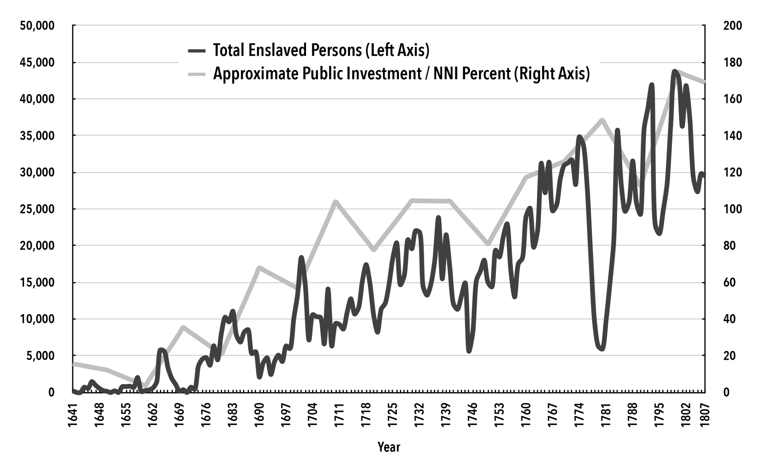Fuentes y notas: Datos de la Base de Datos sobre la Trata Transatlántica de Esclavos; Clark, « Los Agregados Macroeconómicos de Inglaterra, 1209-2008 »; y Thomas E. Lambert, « Inversión Pública Británica, Gasto Público, Vivienda y la Revolución Industrial: Un Estudio de la Absorción del Excedente Gubernamental y Social », Journal of Economic Issues 58, n.º 4 (diciembre de 2024): 1378-1401. La inversión pública estimada se expresa como porcentaje del ingreso nacional neto per cápita.