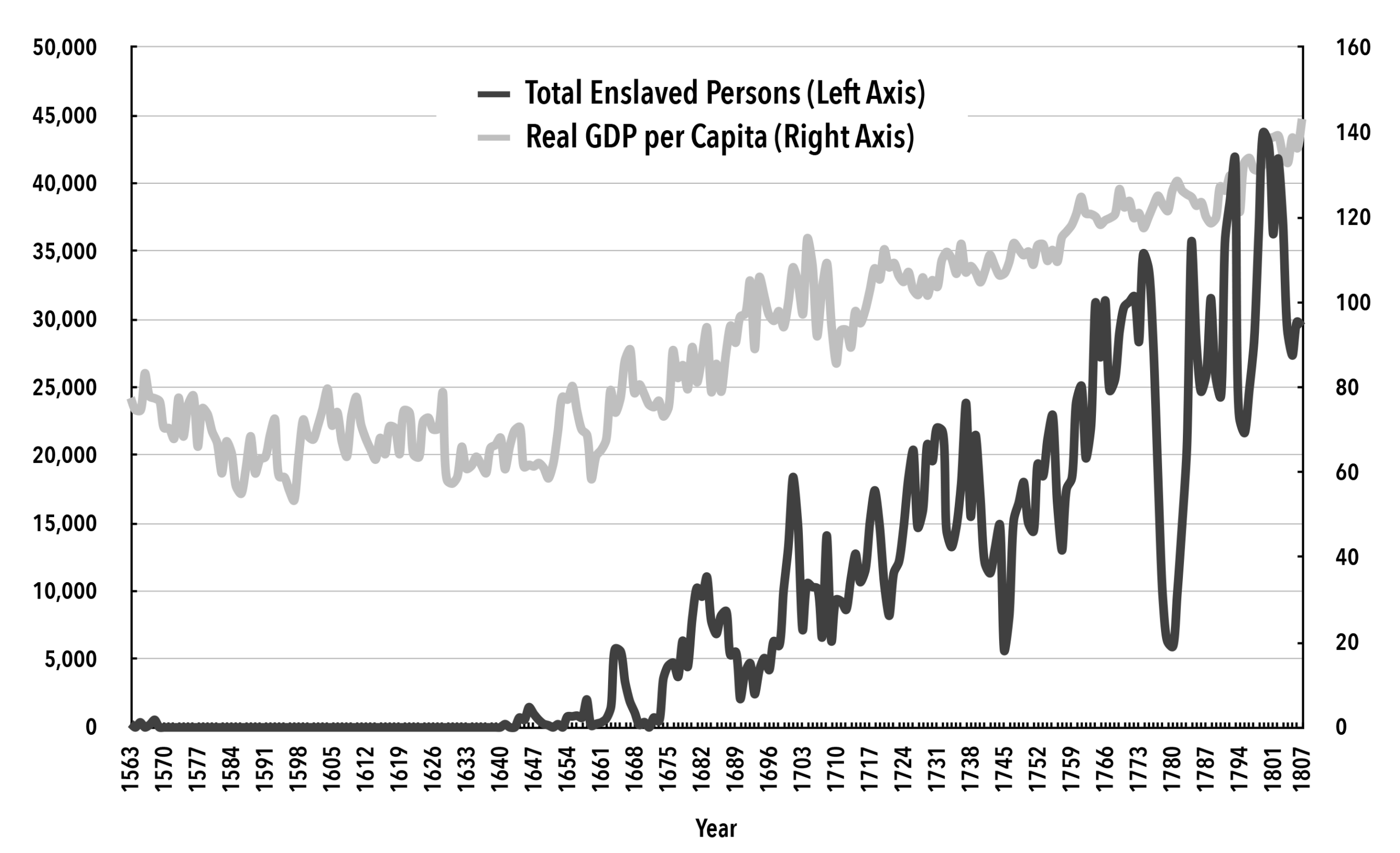 Durante los últimos veinte años aproximadamente, se han desarrollado dos grandes conjuntos de datos que ofrecen conjeturas sofisticadas sobre el crecimiento y desarrollo de la economía británica desde el siglo XIII hasta el siglo XIX. Gregory Clark y, posteriormente, un grupo de historiadores económicos, entre ellos Stephen Broadberry, Bruce MS Campbell, Alexander Klein, Mark Overton y Bas van Leeuwan, han calculado y publicado estimaciones de varios tipos de agregados económicos nacionales, como el Producto Interno Bruto (PIB), el ingreso nacional neto (INN), los índices de precios, etc., así como aproximaciones de la actividad económica de varias industrias, los salarios laborales y las estimaciones de población a lo largo de los siglos para Gran Bretaña. 10 Desde 1999, los datos sobre la trata de esclavos que se remontan al siglo XVI están disponibles en la Base de Datos sobre la Trata Transatlántica de Esclavos. El valor de las nuevas personas esclavizadas vendidas en América se puede obtener de los registros de la Oficina del Censo de los Estados Unidos. 11 Más allá de esto, los datos de registros históricos reales se encuentran en las Estadísticas Históricas Británicas de B. R. Mitchell, que enumeran en tablas la producción de diferentes industrias y bienes y servicios como el azúcar, el estaño y el hierro; los valores de las exportaciones e importaciones; y los montos de las finanzas públicas, entre otros registros de Gran Bretaña e Irlanda. En muchos casos, estos se remontan a la última década del siglo XVII. 12 Estas bases de datos, así como las que he elaborado y utilizado en este y otros artículos, se emplean en algunos de los gráficos que siguen, y otras se publican en el documento de trabajo más extenso del que se deriva este ensayo. 13