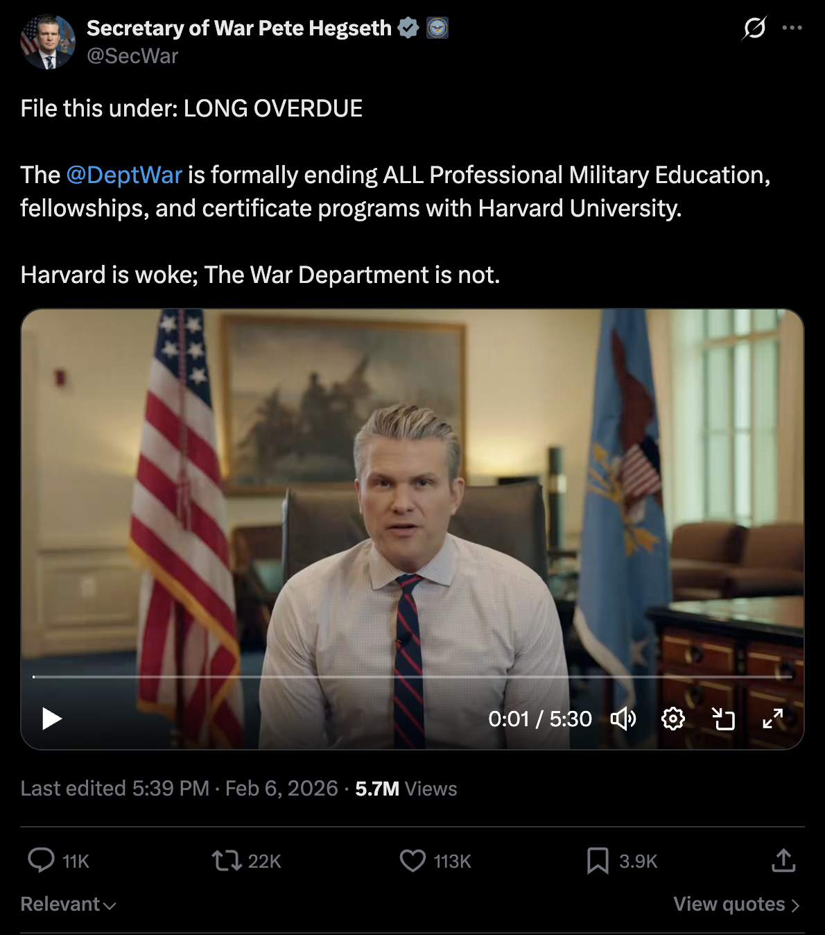 “Durante demasiado tiempo, este departamento ha enviado a nuestros mejores y más brillantes oficiales a Harvard, con la esperanza de que la universidad comprendiera y apreciara mejor a nuestra clase guerrera”, dijo [Hegseth]. “En cambio, muchos de nuestros oficiales regresaron con una apariencia demasiado similar a la de Harvard: con la cabeza llena de ideologías globalistas y radicales que no mejoran nuestras filas combatientes…”.