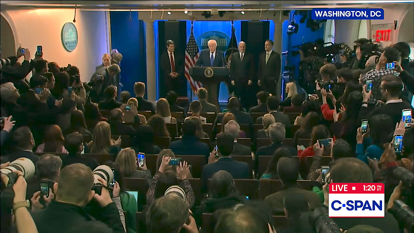 Trump en su conferencia de prensa del viernes denunciando la decisión de la Corte Suprema sobre los aranceles. (Captura de pantalla de C-SPAN/YouTube)