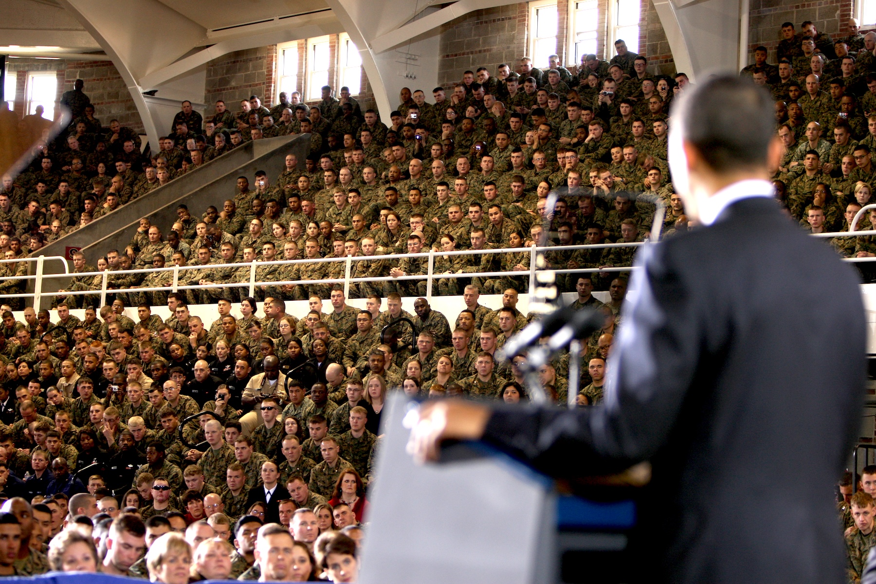 El presidente Barack Obama habla sobre la política de retirada de Estados Unidos de Irak en Camp Lejeune, Carolina del Norte, el 27 de febrero de 2009. (Cuerpo de Marines de EE. UU. / Michael J. Ayotte)