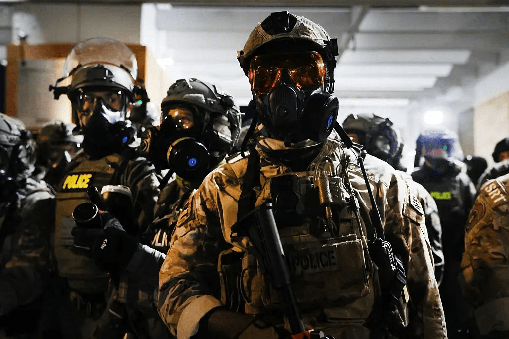 El programa 1033 canalizó miles de millones de dólares en excedentes de equipo militar —desde vehículos blindados y helicópteros hasta gafas de visión nocturna y rifles de asalto— a los departamentos de policía locales. La respuesta policial en Ferguson, Misuri, en 2014, que se asemejaba a un ejército de ocupación enfrentándose a una población insurgente, fue una manifestación visual y táctica directa de este flujo. Ahora se refleja en el ICE, una agencia cuyo presupuesto anual de 30 mil millones de dólares iguala los presupuestos militares de Italia, Israel y Brasil.