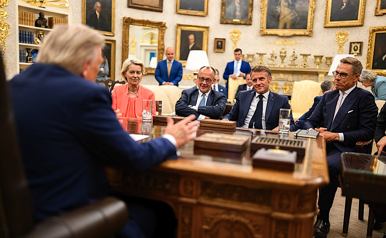 Trump da una charla a los líderes europeos en el Despacho Oval, agosto de 2025. (Casa Blanca/Wikimedia Commons)