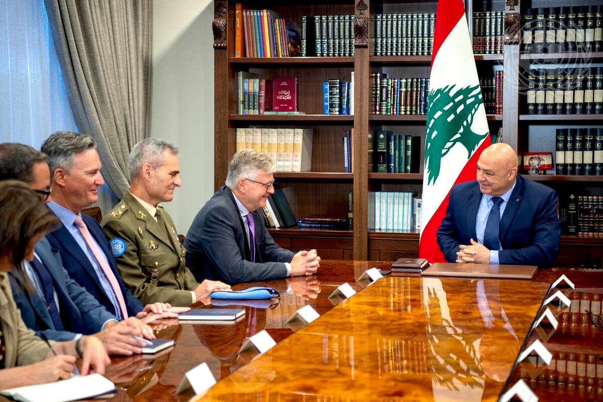 El presidente del Líbano, Joseph Aoun, presidiendo la mesa, junto a funcionarios de la ONU durante su visita a la Fuerza Provisional de las Naciones Unidas en el Líbano (UNIFIL), el 6 de junio de 2025. (Foto de la ONU/Pasqual Gorriz)