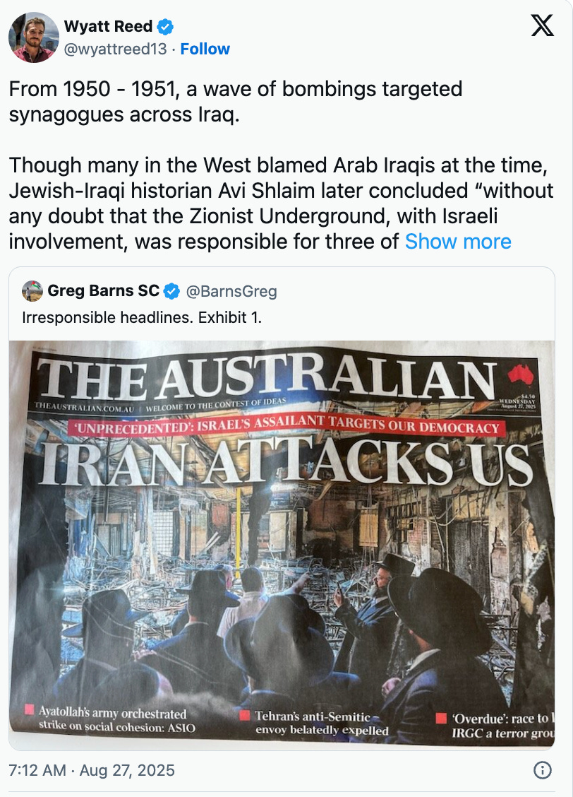 Existe una alta probabilidad de que un plan similar se haya puesto en marcha en Australia mucho más recientemente. Cuando una ola de ataques contra comunidades judías siguió rápidamente a la decisión del primer ministro australiano, Antony Albanese, de reconocer un Estado palestino en 2025, los medios de comunicación australianos culparon de inmediato a Irán. Esta creencia, según se supo después, también se basaba en la influencia israelí.