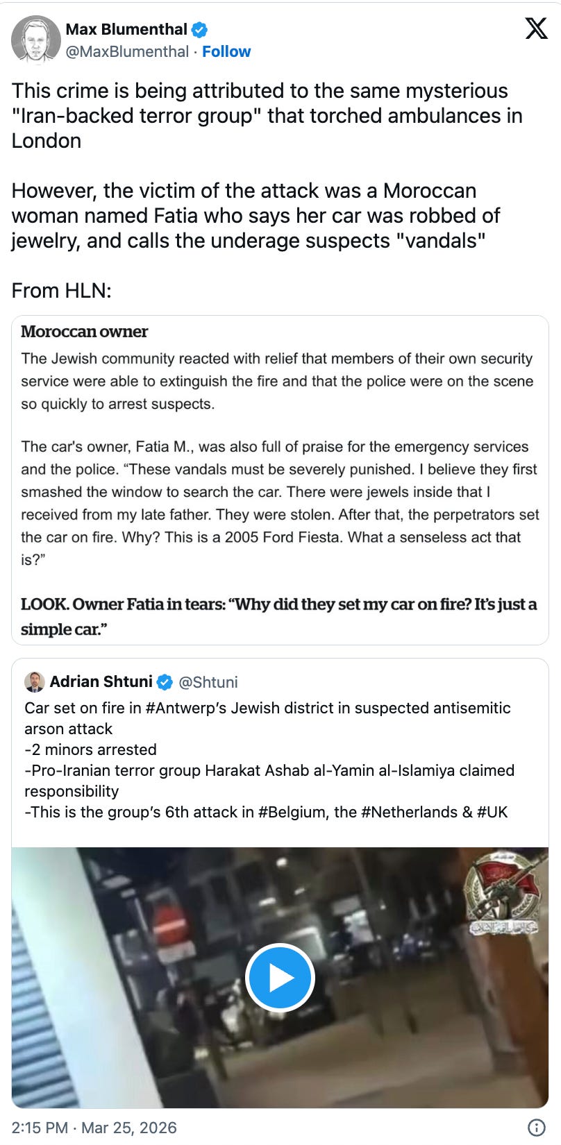 La misma noche del ataque a la ambulancia en Londres, dos menores fueron arrestados por incendiar un automóvil en Amberes, Bélgica. Aunque el crimen ocurrió en un barrio judío, la víctima fue identificada como una mujer marroquí llamada Fatia. Según declaró a un medio belga, su vehículo había sido objeto de un robo con violencia por parte de vándalos que querían las joyas que guardaba en él.