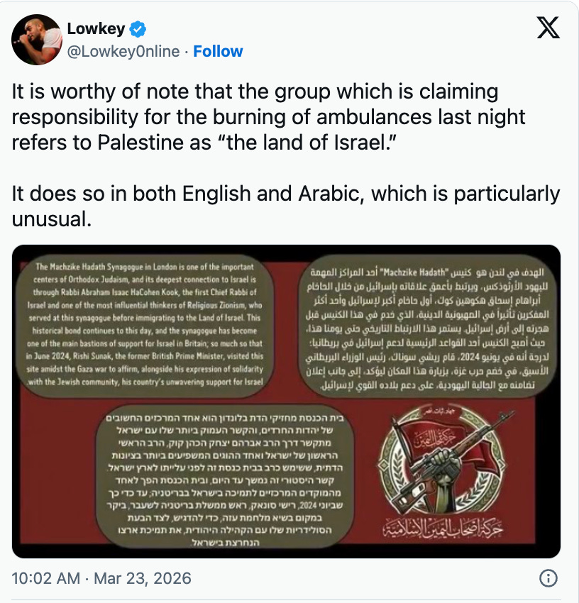 Aunque la organización HAYI, de identidad difusa, reivindicó la autoría del incendio de ambulancias pertenecientes a una organización judía en Londres el 23 de marzo, dos sospechosos del ataque han sido puestos en libertad bajo fianza y no se les imputa ningún delito relacionado con el terrorismo. Además, la Policía Metropolitana de Londres se ha negado hasta el momento a revelar los nombres de los hombres, lo que plantea interrogantes sobre su identidad. ¿Eran siquiera musulmanes?