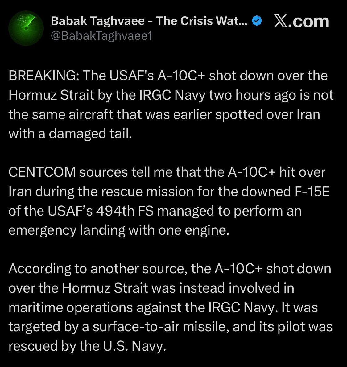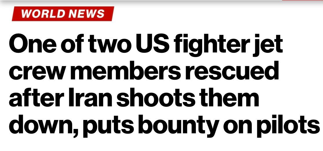 1. Un F-15E «Strike Eagle» de la Fuerza Aérea de EE. UU. fue alcanzado por fuego iraní y se estrelló en Irán. Ambos tripulantes sobrevivieron, uno de ellos fue rescatado, y se está llevando a cabo una gran operación de búsqueda y rescate en combate para el segundo.