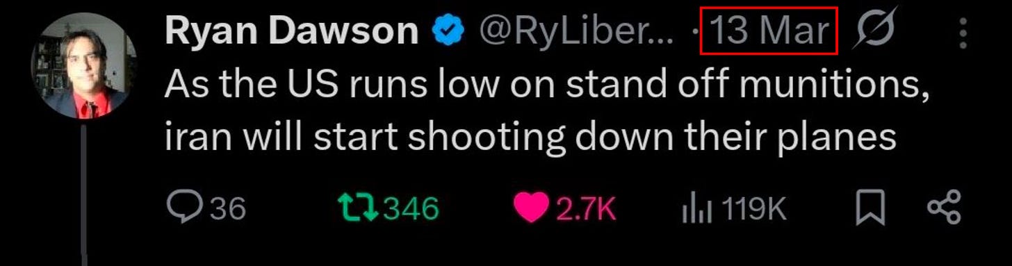 Por cierto, algunos predijeron hace semanas que, a medida que disminuyeran las reservas de municiones de Estados Unidos, Irán tendría más éxito derribando objetivos aéreos estadounidenses:
