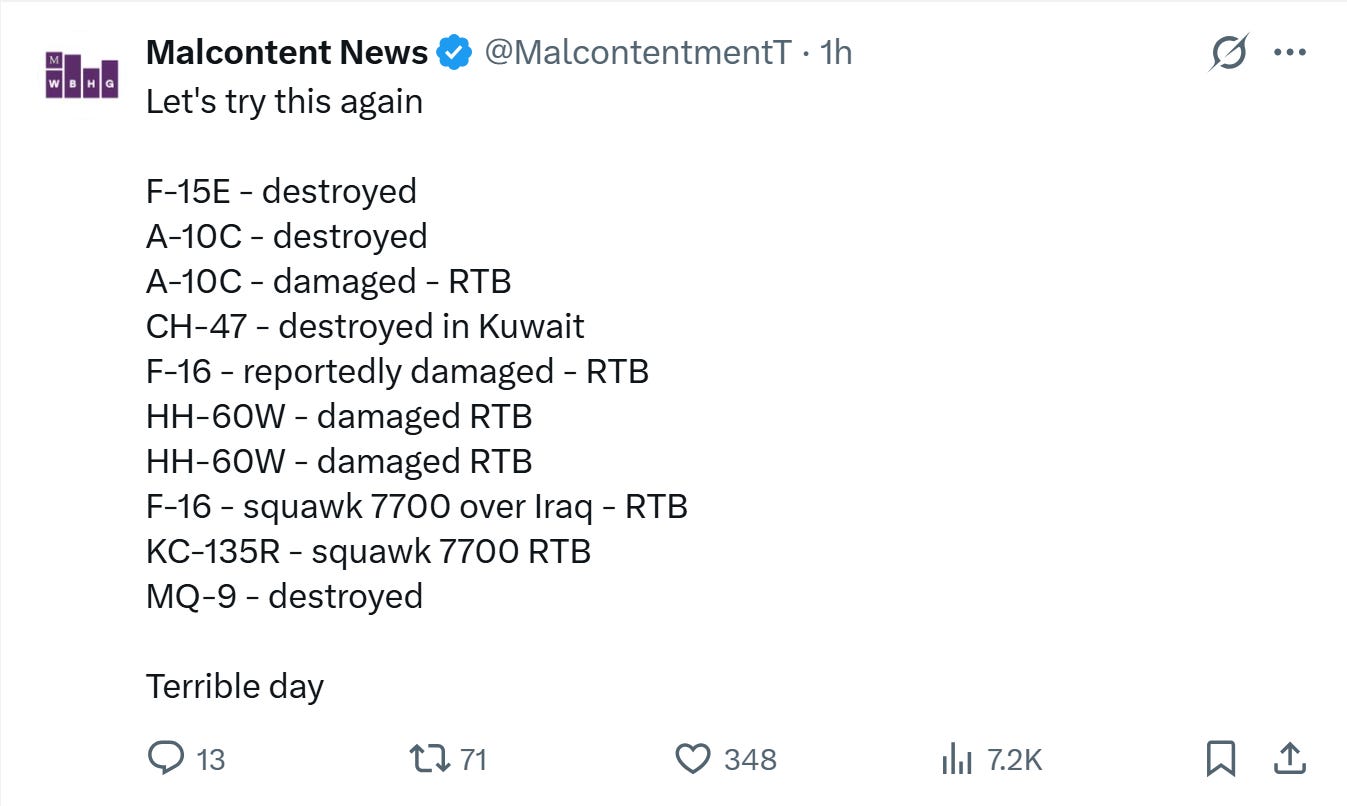 Los aviones más destacados del recuento actual son el F-15 y el A-10 que se confirmó que fueron derribados tras ser alcanzados en el aire por la defensa aérea iraní. Pero además de estos, se informó que varias otras aeronaves fueron alcanzadas en tierra: