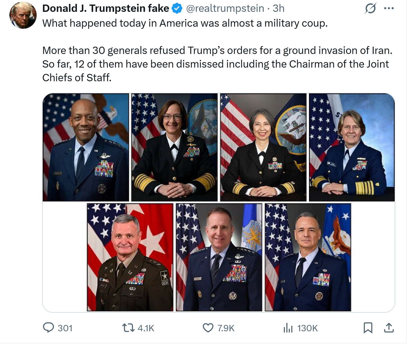 Lo que hizo que los acontecimientos fueran aún más interesantes fue el hecho de que, en el contexto de una campaña militar fallida, Hegseth llevó a cabo una purga en las altas esferas del ejército estadounidense. Esto dio lugar a los rumores y conclusiones lógicas de que se estaba produciendo una especie de motín entre bastidores en relación con los desastrosos planes de Trump para las operaciones terrestres en Irán, aunque algunos de los que se mencionan a continuación fueron purgados semanas atrás: