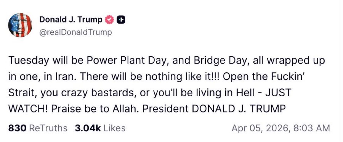 Trump amenaza con una guerra total contra la infraestructura que sustenta la vida civil en Irán, lo cual constituye claramente un crimen de guerra. Le ha dado a Irán un nuevo plazo —el martes a las 8 pm (hora del este)— para abrir el estrecho de Ormuz o, de lo contrario, “vivirán en el infierno”.