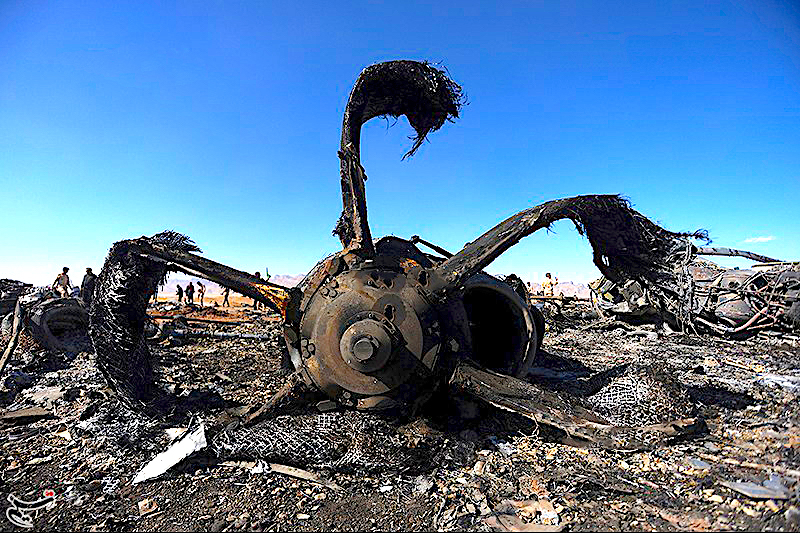 Parte de un avión estadounidense destruido por Irán el 6 de abril de 2026. (Morteza Salehi/Agencia de Noticias Tasnim/Wikimedia Commons)