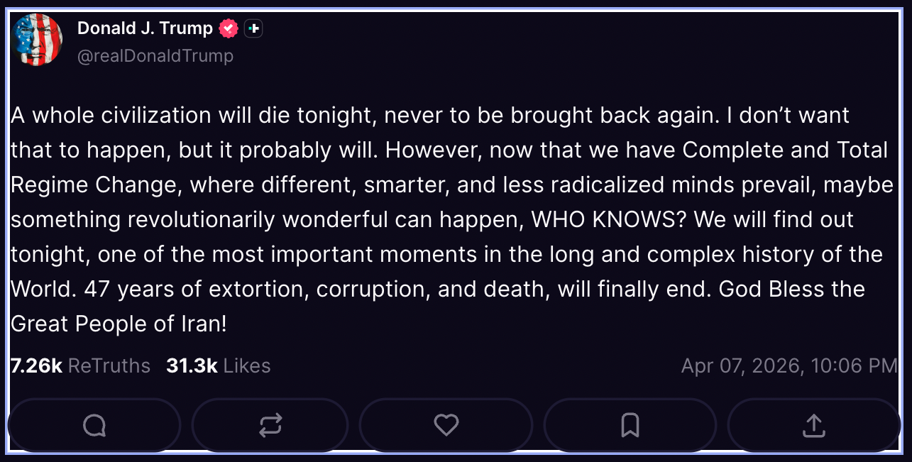 La publicación se produjo 12 horas antes de que expirara el plazo que Trump había dado a Irán esta noche para que abrira el estrecho de Ormuz a todo el tráfico marítimo, o de lo contrario bombardearía Irán «hasta reducirlo a la Edad de Piedra, donde pertenece», como prometió en un discurso al mundo la semana pasada.