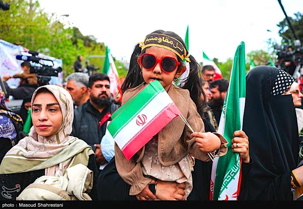 Niños y adolescentes se reunieron con sus familias en la calle Hijab de Teherán el martes 7 de abril de 2026, en el cuadragésimo día del martirio de los estudiantes de Minab asesinados por un misil estadounidense. (Masoud Shahrestani/Agencia de Noticias Tasnim/Wikimedia)