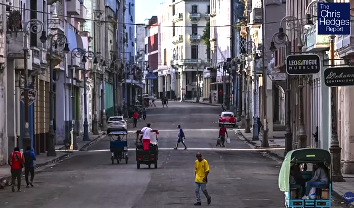 Chris Hedges: Hablemos de la situación de Cuba. Es decir, Cuba ha estado acosada, por supuesto, por sanciones durante décadas. Y, rápidamente, todo tipo de intentos de la CIA para derrocar al gobierno de Castro, la invasión de Bahía de Cochinos, que Cuba frustró durante la administración Kennedy. Creo que hubo siete intentos de asesinato coordinados contra el propio Castro. Me refiero a todo tipo de cosas extrañas, como cigarros explosivos, si mal no recuerdo, y, no sé, trozos de coral envenenados o algo así. No recuerdo qué era todo. Pero esta guerra contra Cuba nunca ha cesado, aunque en muchos sentidos lo que está sucediendo ahora, y te dejo que comentas sobre eso, es quizás lo más grave.