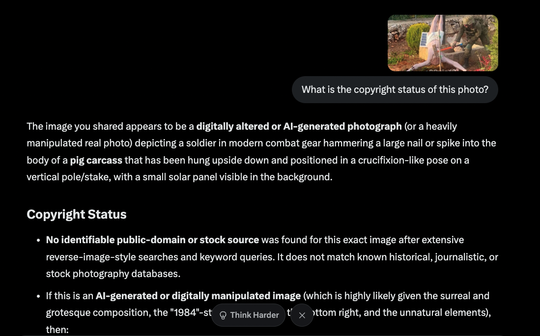“La imagen que compartió parece ser una fotografía alterada digitalmente o generada por IA (o una fotografía real muy manipulada) que muestra a un soldado con equipo de combate moderno clavando un clavo grande o una estaca en el cuerpo de la carcasa de un cerdo que ha sido colgada boca abajo y colocada en una postura similar a la de una crucifixión en un poste/estaca vertical, con un pequeño panel solar visible al fondo.”