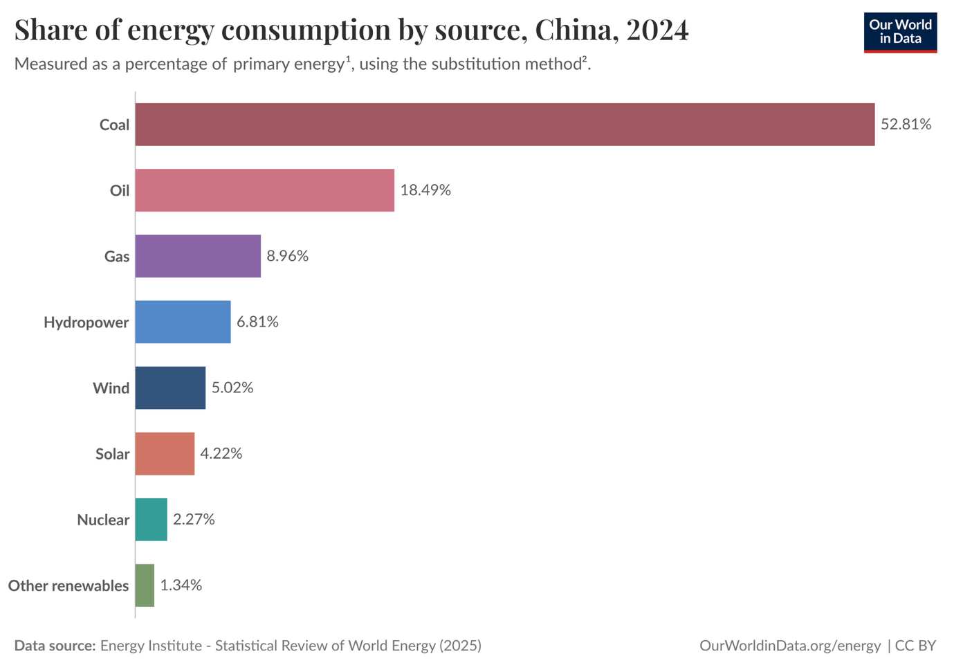 En quinto lugar, el petróleo ni siquiera representa la mayor parte del consumo energético de China: este porcentaje proviene del carbón, con un 53% (véase el gráfico inferior). El petróleo constituye una proporción mucho menor, de tan solo el 18,5%. De este porcentaje, el 30% corresponde a la producción nacional. Como hemos visto, el yacimiento de Hormuz representa solo el 42% de las importaciones de petróleo de China. Por lo tanto, la cantidad excluida es ligeramente inferior al 6% del consumo energético total del país. Esta proporción del consumo energético primario de China es mucho menor que la que proviene de las energías renovables, que representan el 18%.