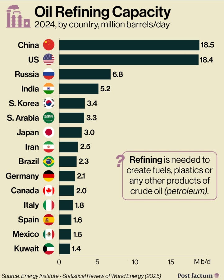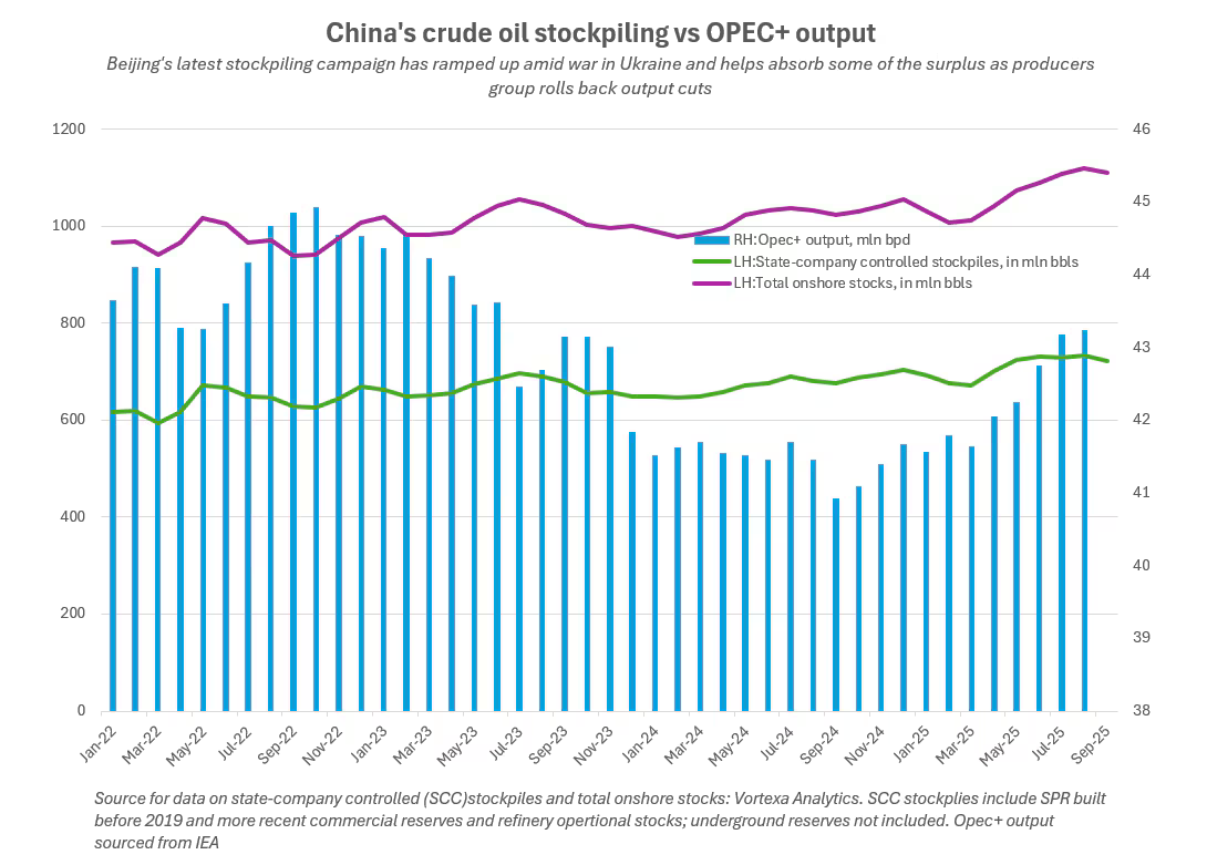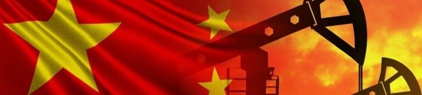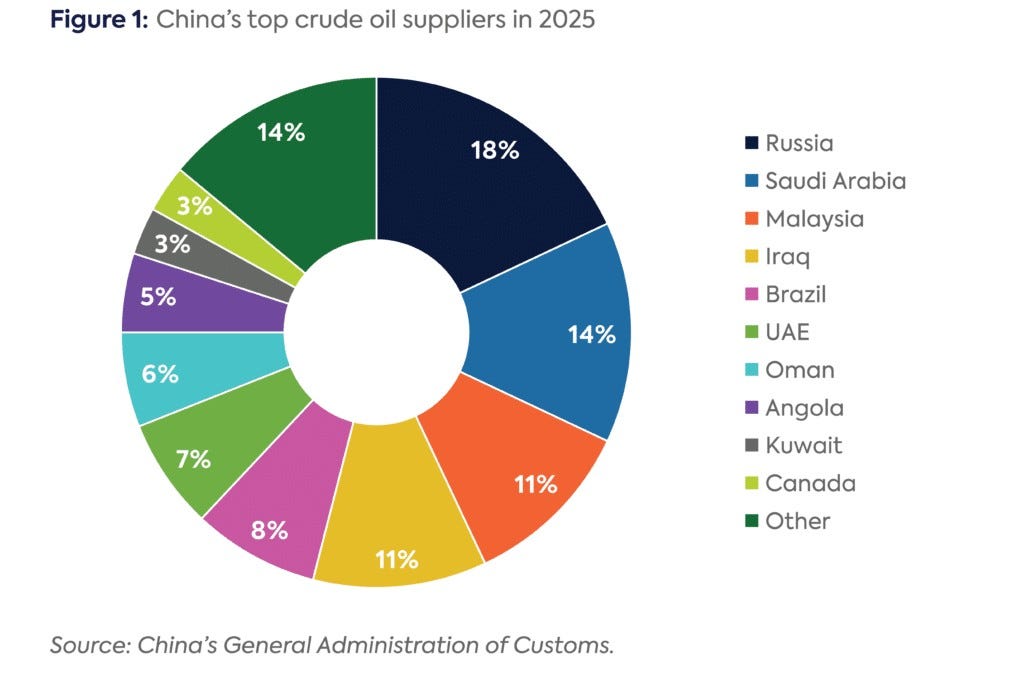 China importa entre el 70 % y el 73 % de su petróleo crudo, con un promedio de importaciones marítimas de entre 11 y 11,5 millones de barriles diarios en los últimos años. En 2025, entre el 40 % y el 50 % de esas importaciones de crudo procedían de Oriente Medio (Arabia Saudita, 14 %; Irak, 11 %; e Irán, extraoficialmente mediante barriles reetiquetados, entre el 11 % y el 12 %). Aproximadamente entre el 45 % y el 50 % del total de las importaciones de crudo (o cerca del 35 % del suministro total de crudo si se incluye la producción nacional) transitaban por el estrecho de Ormuz.